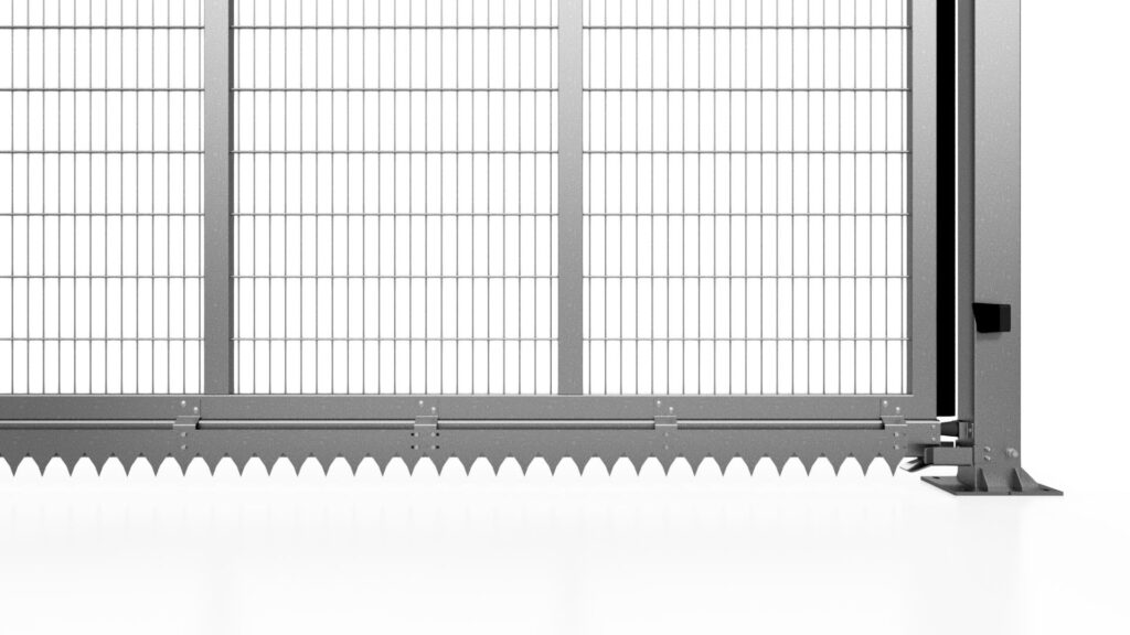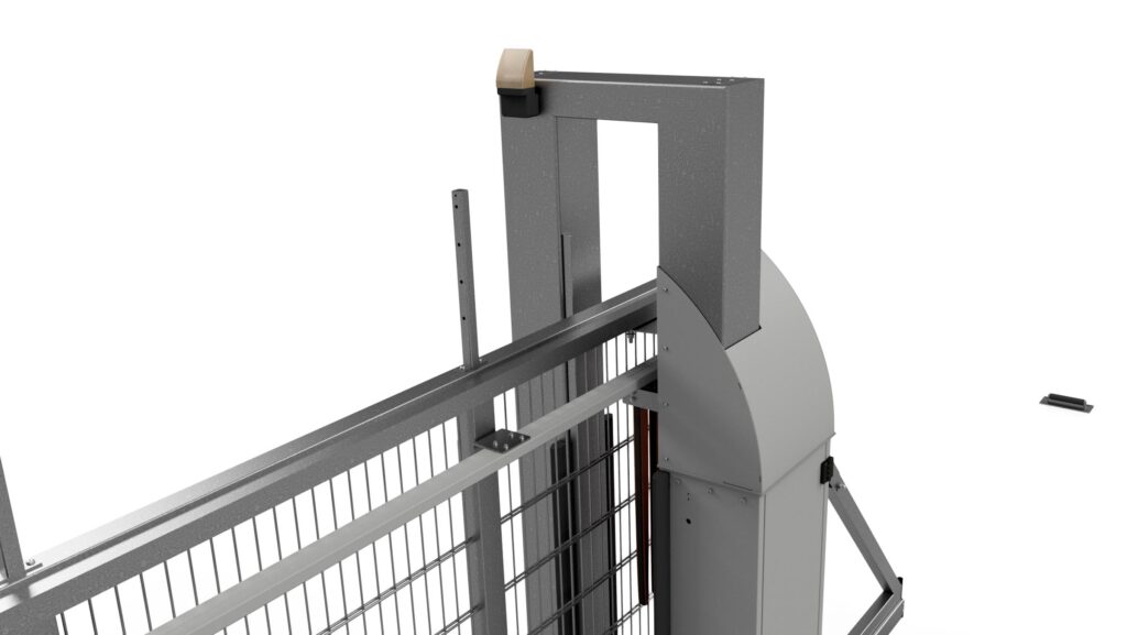 The wing is supported and guided by 2 roller sets with ball bearings, integrated in the underbeam. One roller set is mounted on the base plate of the guide post and the second independent roller set is installed at the rear end of the foundation. Both roller sets support the underbeam in order to guarantee perfect guiding of the gate wing.
