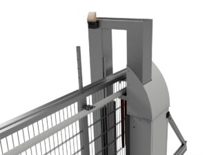 The standard one sided end post is made of square tube and is equipped with a catcher, electromagnetic lock and a base to guide and support the wing when the gate is closed.