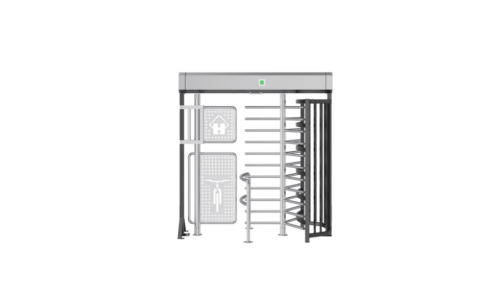 The turnstile has a rotating spindle with 3 (120 degree) arms and a separate spindle suitable for bicycles.