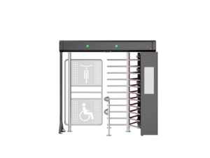 The turnstile has a rotating spindle with three arms (120 degrees) and a separate spindle suitable for bicycles/wheelchairs.