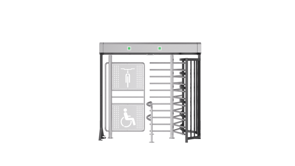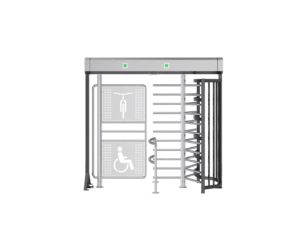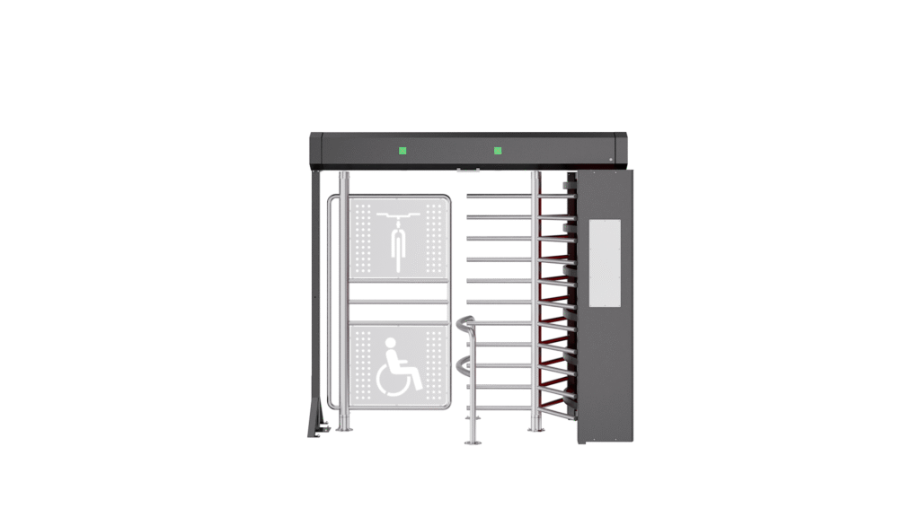 The turnstile has a rotating spindle with three arms (120 degrees) and a separate spindle suitable for bicycles/wheelchairs.